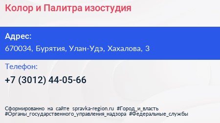 Колор и Палитра, изостудия по адресу 670034, Бурятия, Улан-Удэ, Хахалова, 3 в дальнейшем Организация, размещена в следующих категориях:
