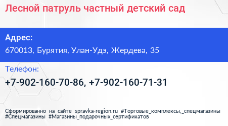 Лесной патруль, частный детский сад по адресу 670013, Бурятия, Улан-Удэ, Жердева, 35 в дальнейшем Организация, размещена в следующих категориях: