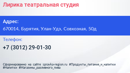 Лирика, театральная студия по адресу 670014, Бурятия, Улан-Удэ, Совхозная, 50д в дальнейшем Организация, размещена в следующих категориях: