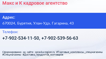 Макс и К, кадровое агентство по адресу 670024, Бурятия, Улан-Удэ, Гагарина, 43 в дальнейшем Организация, размещена в следующих категориях: