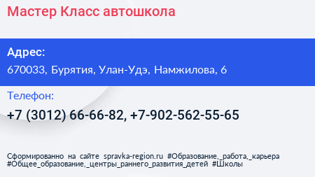 Мастер Класс, автошкола по адресу 670033, Бурятия, Улан-Удэ, Намжилова, 6 в дальнейшем Организация, размещена в следующих категориях: