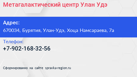 Метагалактический центр Улан-Удэ по адресу 670034, Бурятия, Улан-Удэ, Хоца Намсараева, 7а в дальнейшем Организация, размещена в следующих категориях:
