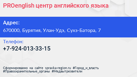 PROenglish, центр английского языка по адресу 670000, Бурятия, Улан-Удэ, Сухэ-Батора, 7 в дальнейшем Организация, размещена в следующих категориях: