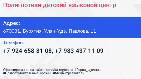 Полиглотики, детский языковой центр по адресу 670031, Бурятия, Улан-Удэ, Павлова, 11 в дальнейшем Организация, размещена в следующих категориях: