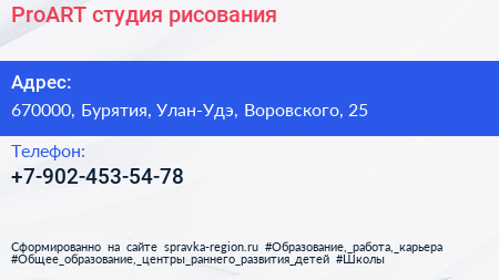 ProART, студия рисования по адресу 670000, Бурятия, Улан-Удэ, Воровского, 25 в дальнейшем Организация, размещена в следующих категориях: