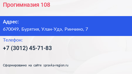 Прогимназия №108 по адресу 670049, Бурятия, Улан-Удэ, Ринчино, 7 в дальнейшем Организация, размещена в следующих категориях: