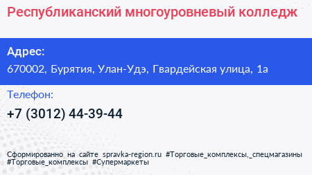 Республиканский многоуровневый колледж по адресу 670002, Бурятия, Улан-Удэ, Гвардейская улица, 1а в дальнейшем Организация, размещена в следующих категориях: