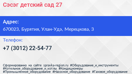 Сэсэг, детский сад №27 по адресу 670023, Бурятия, Улан-Удэ, Мерецкова, 3 в дальнейшем Организация, размещена в следующих категориях: