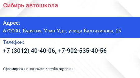 Сибирь, автошкола по адресу 670000, Бурятия, Улан-Удэ, улица Балтахинова, 15 в дальнейшем Организация, размещена в следующих категориях: