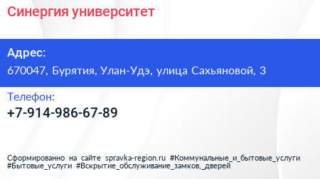 Синергия, университет по адресу 670047, Бурятия, Улан-Удэ, улица Сахьяновой, 3 в дальнейшем Организация, размещена в следующих категориях: