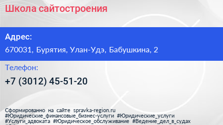Школа сайтостроения по адресу 670031, Бурятия, Улан-Удэ, Бабушкина, 2 в дальнейшем Организация, размещена в следующих категориях: