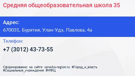 Средняя общеобразовательная школа №35 по адресу 670031, Бурятия, Улан-Удэ, Павлова, 4а в дальнейшем Организация, размещена в следующих категориях: