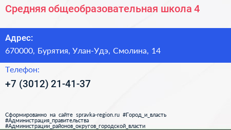 Средняя общеобразовательная школа №4 по адресу 670000, Бурятия, Улан-Удэ, Смолина, 14 в дальнейшем Организация, размещена в следующих категориях:
