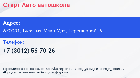 Старт Авто, автошкола по адресу 670031, Бурятия, Улан-Удэ, Терешковой, 6 в дальнейшем Организация, размещена в следующих категориях: