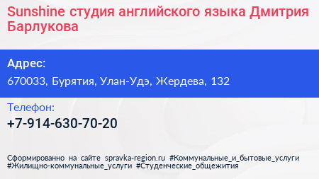 Sunshine, студия английского языка Дмитрия Барлукова по адресу 670033, Бурятия, Улан-Удэ, Жердева, 132 в дальнейшем Организация, размещена в следующих категориях: