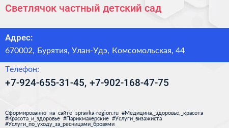 Светлячок, частный детский сад по адресу 670002, Бурятия, Улан-Удэ, Комсомольская, 44 в дальнейшем Организация, размещена в следующих категориях: