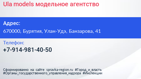 Ula models, модельное агентство по адресу 670000, Бурятия, Улан-Удэ, Банзарова, 41 в дальнейшем Организация, размещена в следующих категориях: