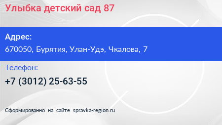 Улыбка, детский сад №87 по адресу 670050, Бурятия, Улан-Удэ, Чкалова, 7 в дальнейшем Организация, размещена в следующих категориях: