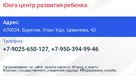 Юнга, центр развития ребенка по адресу 670034, Бурятия, Улан-Удэ, Цивилева, 42 в дальнейшем Организация, размещена в следующих категориях: