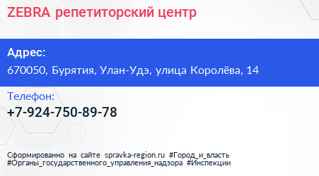 ZEBRA, репетиторский центр по адресу 670050, Бурятия, Улан-Удэ, улица Королёва, 14 в дальнейшем Организация, размещена в следующих категориях: