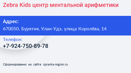 Zebra Kids, центр ментальной арифметики по адресу 670050, Бурятия, Улан-Удэ, улица Королёва, 14 в дальнейшем Организация, размещена в следующих категориях: