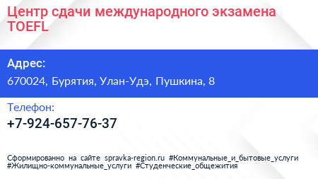 Центр сдачи международного экзамена TOEFL по адресу 670024, Бурятия, Улан-Удэ, Пушкина, 8 в дальнейшем Организация, размещена в следующих категориях:
