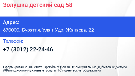 Золушка, детский сад №58 по адресу 670000, Бурятия, Улан-Удэ, Жанаева, 22 в дальнейшем Организация, размещена в следующих категориях: