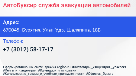 АвтоБуксир, служба эвакуации автомобилей по адресу 670045, Бурятия, Улан-Удэ, Шаляпина, 18Б в дальнейшем Организация, размещена в следующих категориях: