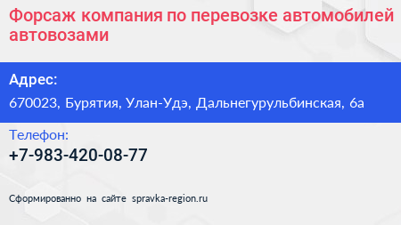 Форсаж, компания по перевозке автомобилей автовозами по адресу 670023, Бурятия, Улан-Удэ, Дальнегурульбинская, 6а в дальнейшем Организация, размещена в следующих категориях: