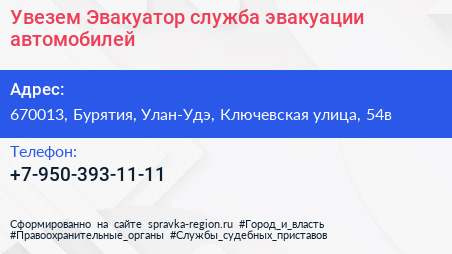 Увезем-Эвакуатор, служба эвакуации автомобилей по адресу 670013, Бурятия, Улан-Удэ, Ключевская улица, 54в в дальнейшем Организация, размещена в следующих категориях: