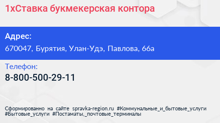 1хСтавка, букмекерская контора по адресу 670047, Бурятия, Улан-Удэ, Павлова, 66а в дальнейшем Организация, размещена в следующих категориях:
