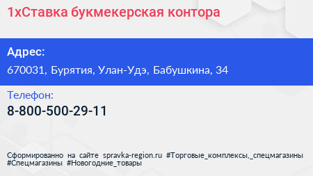 1хСтавка, букмекерская контора по адресу 670031, Бурятия, Улан-Удэ, Бабушкина, 34 в дальнейшем Организация, размещена в следующих категориях: