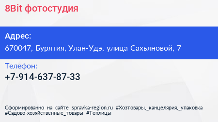 8Bit, фотостудия по адресу 670047, Бурятия, Улан-Удэ, улица Сахьяновой, 7 в дальнейшем Организация, размещена в следующих категориях: