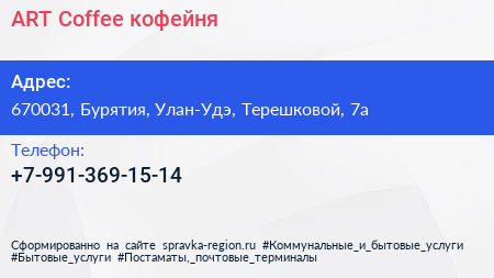 ART Coffee, кофейня по адресу 670031, Бурятия, Улан-Удэ, Терешковой, 7а в дальнейшем Организация, размещена в следующих категориях: