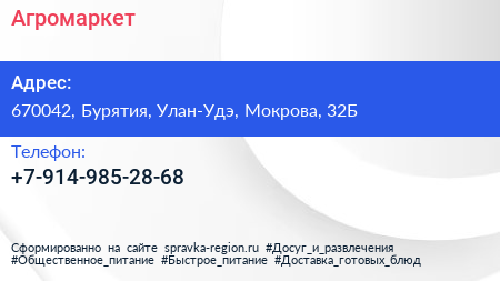 Агромаркет по адресу 670042, Бурятия, Улан-Удэ, Мокрова, 32Б в дальнейшем Организация, размещена в следующих категориях:
