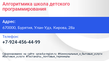 Алгоритмика, школа детского программирования по адресу 670000, Бурятия, Улан-Удэ, Кирова, 28а в дальнейшем Организация, размещена в следующих категориях: