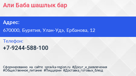 Али-Баба, шашлык-бар по адресу 670000, Бурятия, Улан-Удэ, Ербанова, 12 в дальнейшем Организация, размещена в следующих категориях: