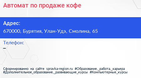 Автомат по продаже кофе по адресу 670000, Бурятия, Улан-Удэ, Смолина, 65 в дальнейшем Организация, размещена в следующих категориях: