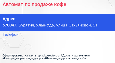 Автомат по продаже кофе по адресу 670047, Бурятия, Улан-Удэ, улица Сахьяновой, 5а в дальнейшем Организация, размещена в следующих категориях: