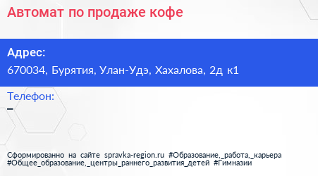 Автомат по продаже кофе по адресу 670034, Бурятия, Улан-Удэ, Хахалова, 2д к1 в дальнейшем Организация, размещена в следующих категориях: