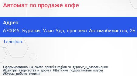 Автомат по продаже кофе по адресу 670045, Бурятия, Улан-Удэ, проспект Автомобилистов, 2Б в дальнейшем Организация, размещена в следующих категориях: