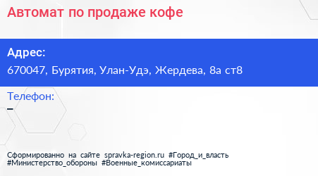 Автомат по продаже кофе по адресу 670047, Бурятия, Улан-Удэ, Жердева, 8а ст8 в дальнейшем Организация, размещена в следующих категориях: