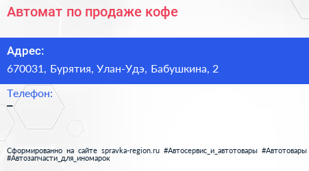 Автомат по продаже кофе по адресу 670031, Бурятия, Улан-Удэ, Бабушкина, 2 в дальнейшем Организация, размещена в следующих категориях: