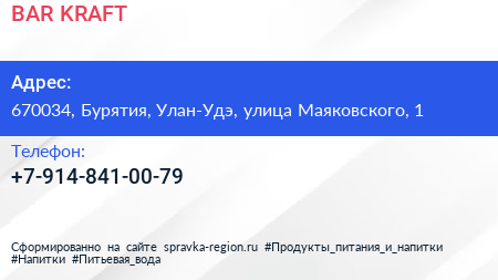 BAR KRAFT по адресу 670034, Бурятия, Улан-Удэ, улица Маяковского, 1 в дальнейшем Организация, размещена в следующих категориях: