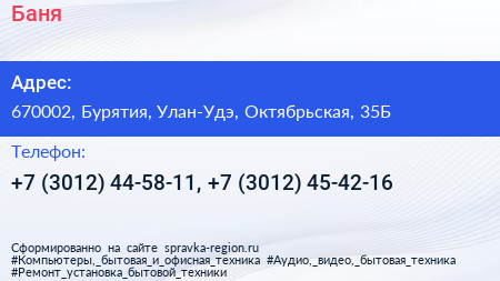 Баня по адресу 670002, Бурятия, Улан-Удэ, Октябрьская, 35Б в дальнейшем Организация, размещена в следующих категориях: