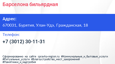 Барселона, бильярдная по адресу 670031, Бурятия, Улан-Удэ, Гражданская, 18 в дальнейшем Организация, размещена в следующих категориях: