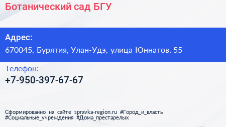 Ботанический сад, БГУ по адресу 670045, Бурятия, Улан-Удэ, улица Юннатов, 55 в дальнейшем Организация, размещена в следующих категориях: