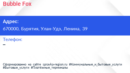 Bubble Fox по адресу 670000, Бурятия, Улан-Удэ, Ленина, 39 в дальнейшем Организация, размещена в следующих категориях: