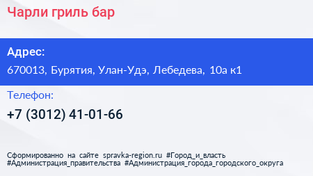 Чарли, гриль-бар по адресу 670013, Бурятия, Улан-Удэ, Лебедева, 10а к1 в дальнейшем Организация, размещена в следующих категориях: