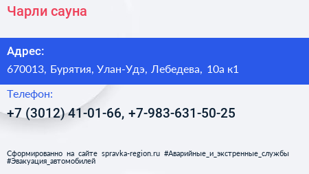 Чарли, сауна по адресу 670013, Бурятия, Улан-Удэ, Лебедева, 10а к1 в дальнейшем Организация, размещена в следующих категориях: